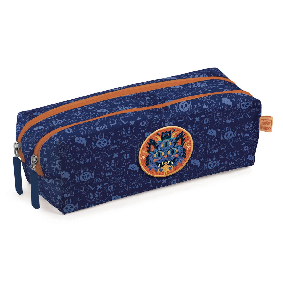 Etui mit einem gestickten „Monster“-Patch und zwei Fächern zur Aufbewahrung der Sachen des Kindes. Jeder Reißverschluss hat ein Silikonmedaillon zum einfachen Öffnen.
