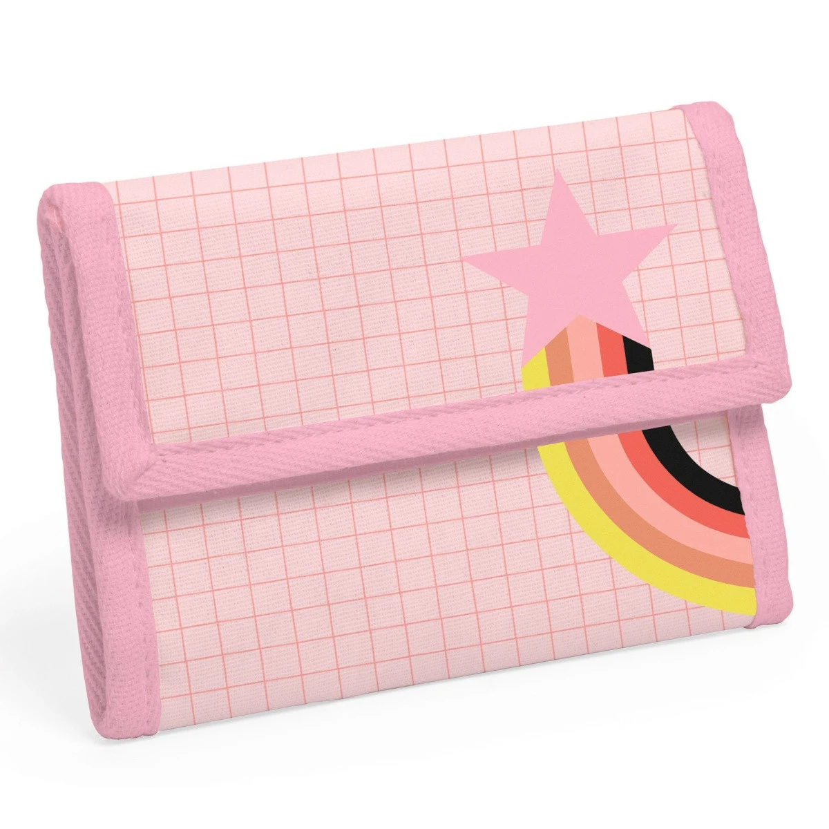 Eine Brieftasche mit Klettverschluss, die mit einem hübschen Sternschnuppenmotiv illustriert ist. Perfekt, um kleine Ersparnisse darin zu verstauen. Aus beschichtetem Stoff und wasserabweisend, damit der Inhalt trocken bleibt. Mit einem Reißverschlussfach für Münzen, einem Fach für Geldscheine und drei Fächern für Karten.