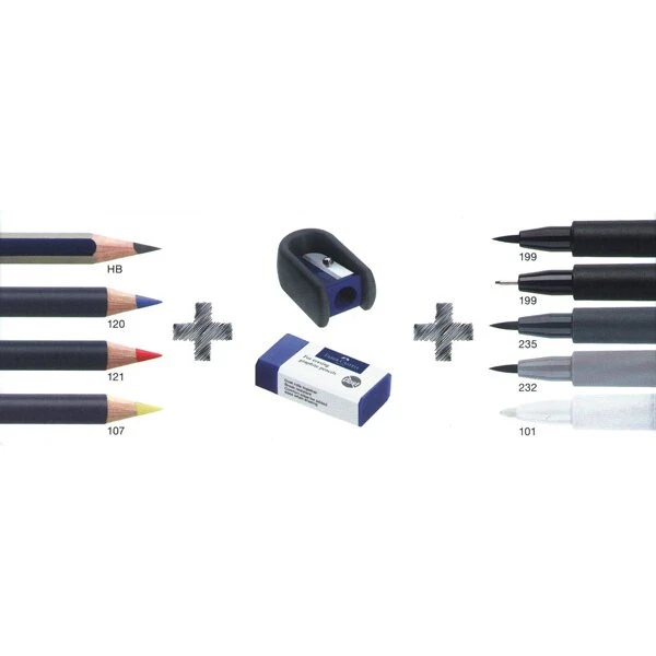 – 11-teiliges Set bestehend aus 5 Pitt Artist Pen Tuschestiften (Rundspitze 1.5 mm Farbe 101 weiß, S = 0.3 mm Farbe 199 schwarz, B = Pinselspitze Farben 199 schwarz, 232 kaltgrau III, 235 kaltgrau VI), 3 Goldfaber Aqua Aquarellfarbstiften (Farben 107 kadmiumgelb, 120 ultramarin, 121 geraniumrot hell), 1 Goldfaber Bleistift HB, 1 Metallspitzer, 1 Radierer