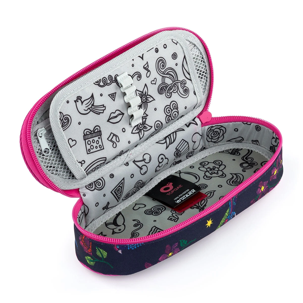 Ovales Federmäppchen für alle Bedürfnisse. Im Inneren befindet sich eine Netztasche mit Reißverschluss und einer Klappe, an der Gummibänder zur Befestigung von insgesamt neun Bleistiften und Stiften angebracht sind, die übersichtlich und griffbereit sein müssen. Der Freiraum unter der Klappe ermöglicht es Ihnen, weitere Schreibwahren frei zu platzieren – Buntstifte, Marker, was auch immer Sie brauchen.