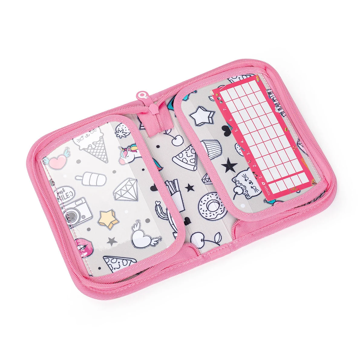 Das einstöckige Federmäppchen mit zwei Klappen ist mit 21 klassischen Gummigriffen für Buntstifte und Marker, drei breiteren Griffen für Lineal, Zirkel oder Schere und zwei größeren Griffen für Gummi und Spitzer ausgestattet. Unter der Klappe aus transparenter Folie befindet sich ein Stundenplan, der zweite wird z.B. auch für Zugbänder verwendet 🙂