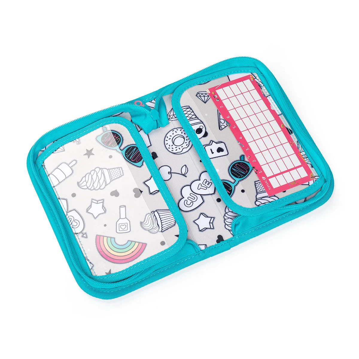 Das einstöckige Federmäppchen mit zwei Klappen ist mit 21 klassischen Gummigriffen für Buntstifte und Marker, drei breiteren Griffen für Lineal, Zirkel oder Schere und zwei größeren Griffen für Gummi und Spitzer ausgestattet. Unter der Klappe aus transparenter Folie befindet sich ein Stundenplan, der zweite wird z.B. auch für Zugbänder verwendet 🙂