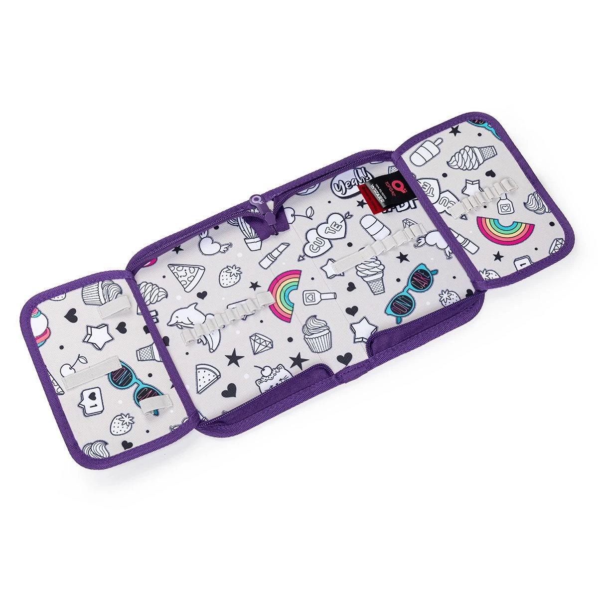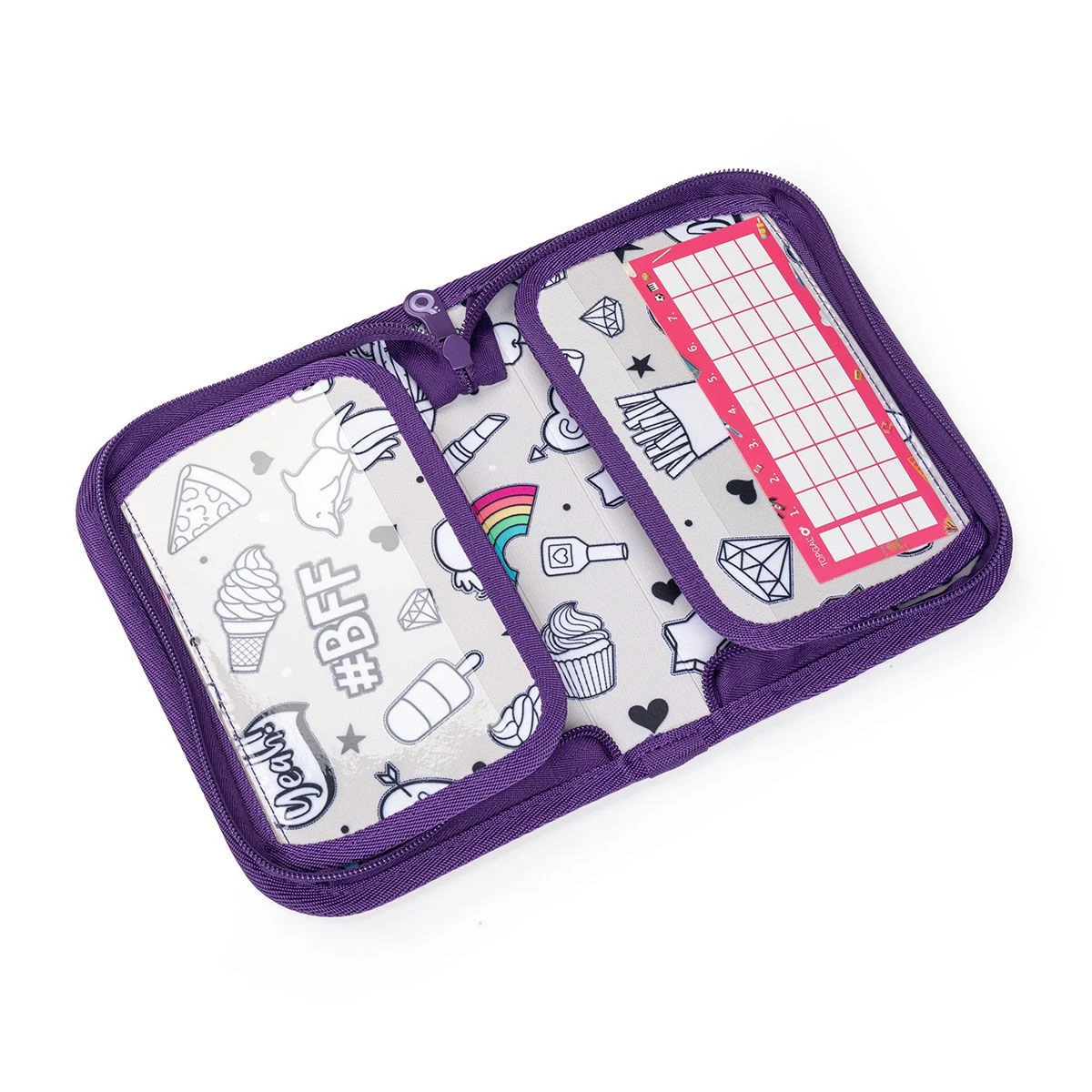 Das einstöckige Federmäppchen mit zwei Klappen ist mit 21 klassischen Gummigriffen für Buntstifte und Marker, drei breiteren Griffen für Lineal, Zirkel oder Schere und zwei größeren Griffen für Gummi und Spitzer ausgestattet. Unter der Klappe aus transparenter Folie befindet sich ein Stundenplan, der zweite wird z.B. auch für Zugbänder verwendet 🙂