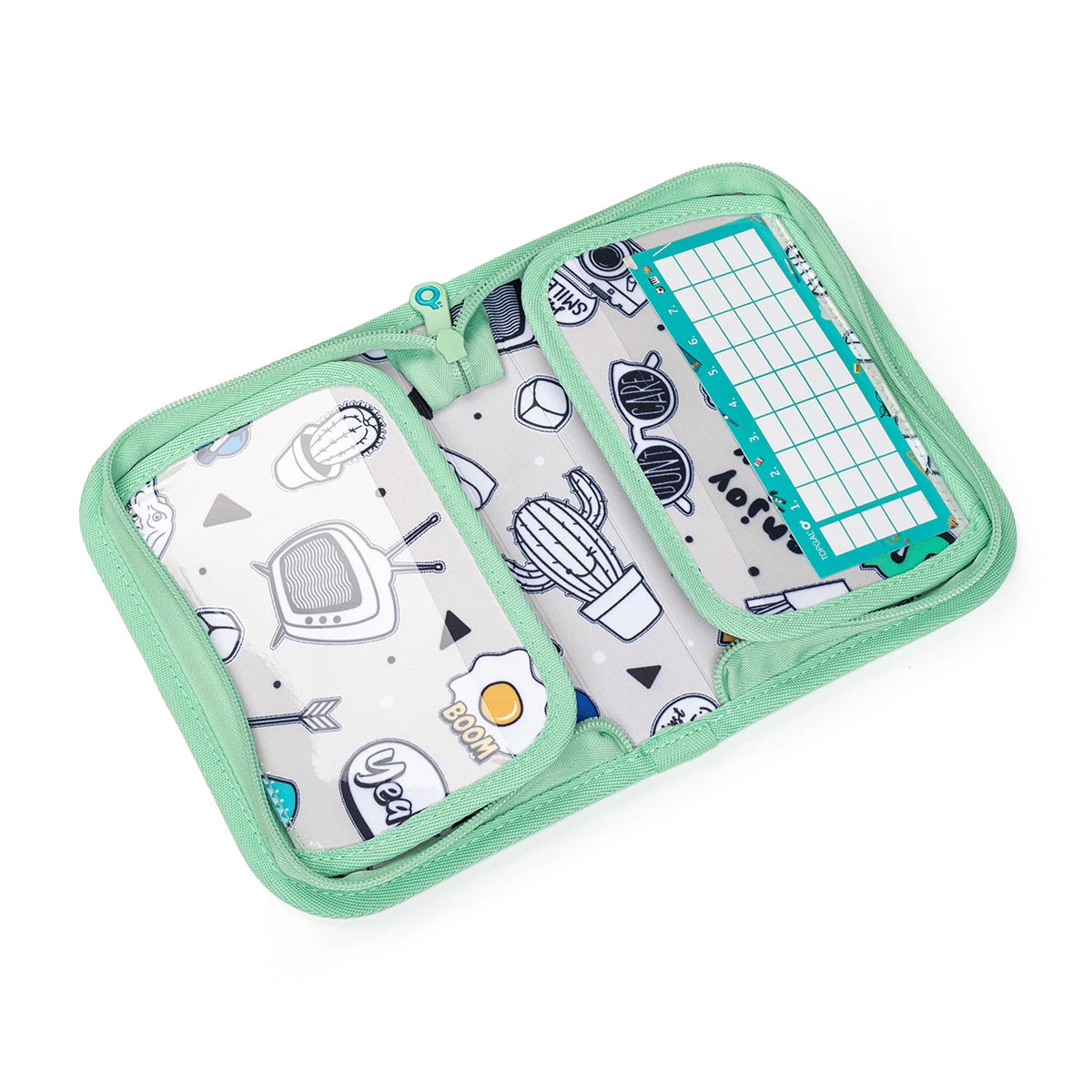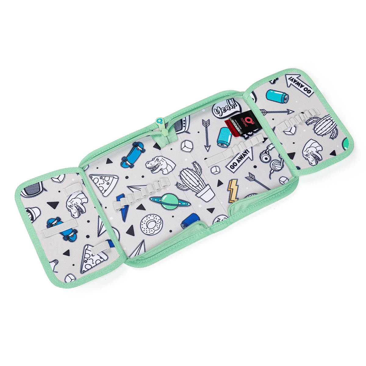 Das einstöckige Federmäppchen mit zwei Klappen ist mit 21 klassischen Gummigriffen für Buntstifte und Marker, drei breiteren Griffen für Lineal, Zirkel oder Schere und zwei größeren Griffen für Gummi und Spitzer ausgestattet. Unter der Klappe aus transparenter Folie befindet sich ein Stundenplan, der zweite wird z.B. auch für Zugbänder verwendet 🙂
