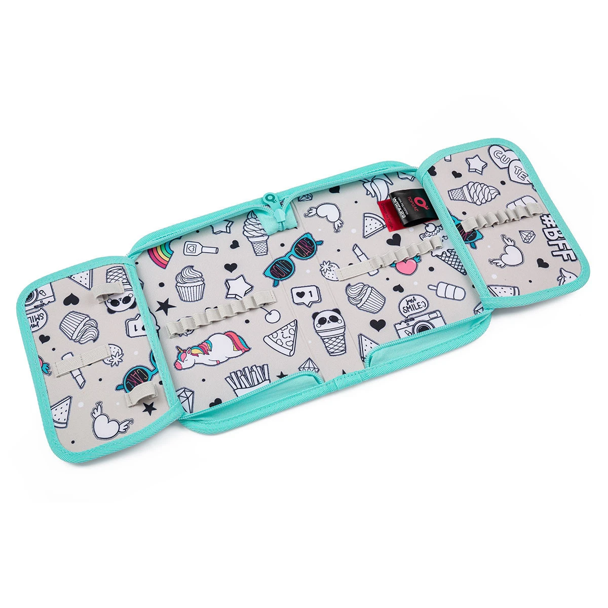 Das einstöckige Federmäppchen mit zwei Klappen ist mit 21 klassischen Gummigriffen für Buntstifte und Marker, drei breiteren Griffen für Lineal, Zirkel oder Schere und zwei größeren Griffen für Gummi und Spitzer ausgestattet. Unter der Klappe aus transparenter Folie befindet sich ein Stundenplan, der zweite wird z.B. auch für Zugbänder verwendet 🙂