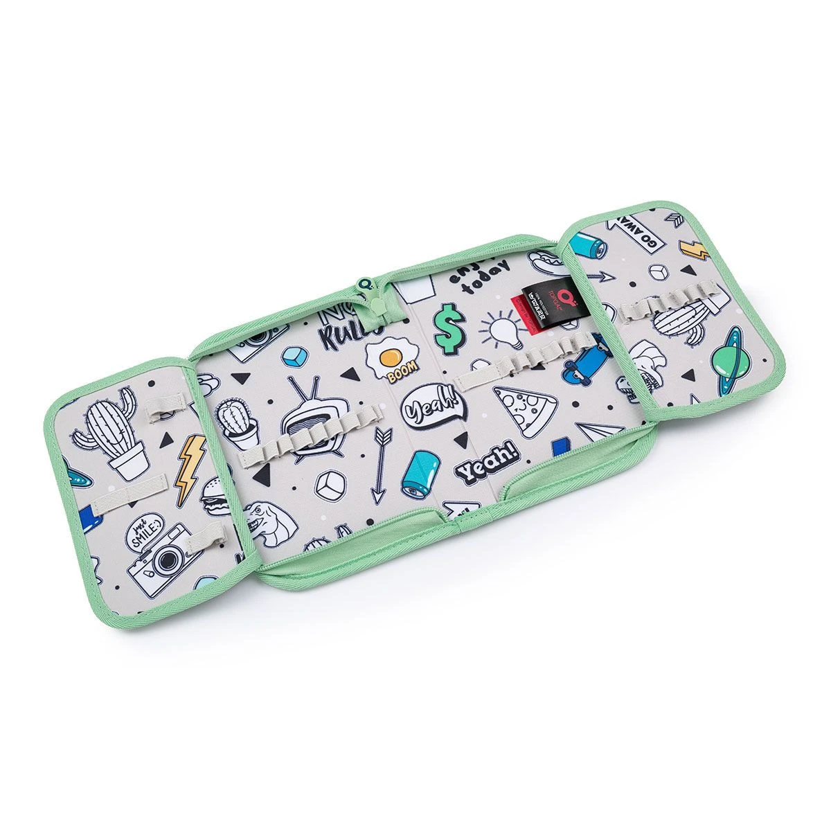 Das einstöckige Federmäppchen mit zwei Klappen ist mit 21 klassischen Gummigriffen für Buntstifte und Marker, drei breiteren Griffen für Lineal, Zirkel oder Schere und zwei größeren Griffen für Gummi und Spitzer ausgestattet. Unter der Klappe aus transparenter Folie befindet sich ein Stundenplan, der zweite wird z.B. auch für Zugbänder verwendet 🙂