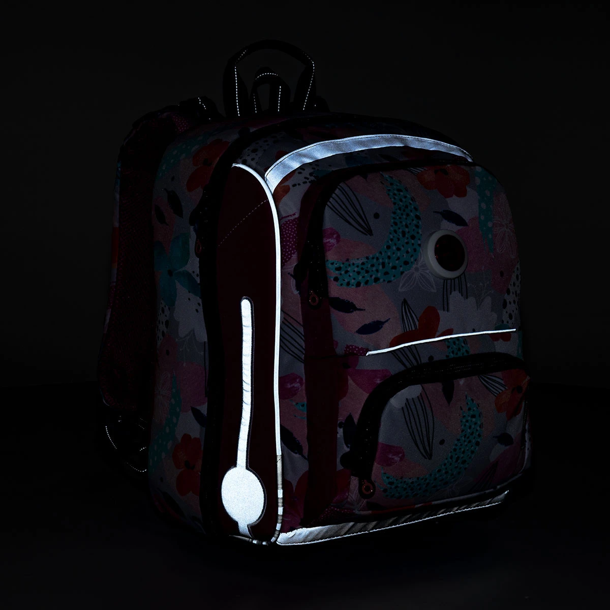 An der Vorderseite, den Seiten und den Schultergurten des Rucksacks befindet sich natürlich einige reflektierenden Elemente.