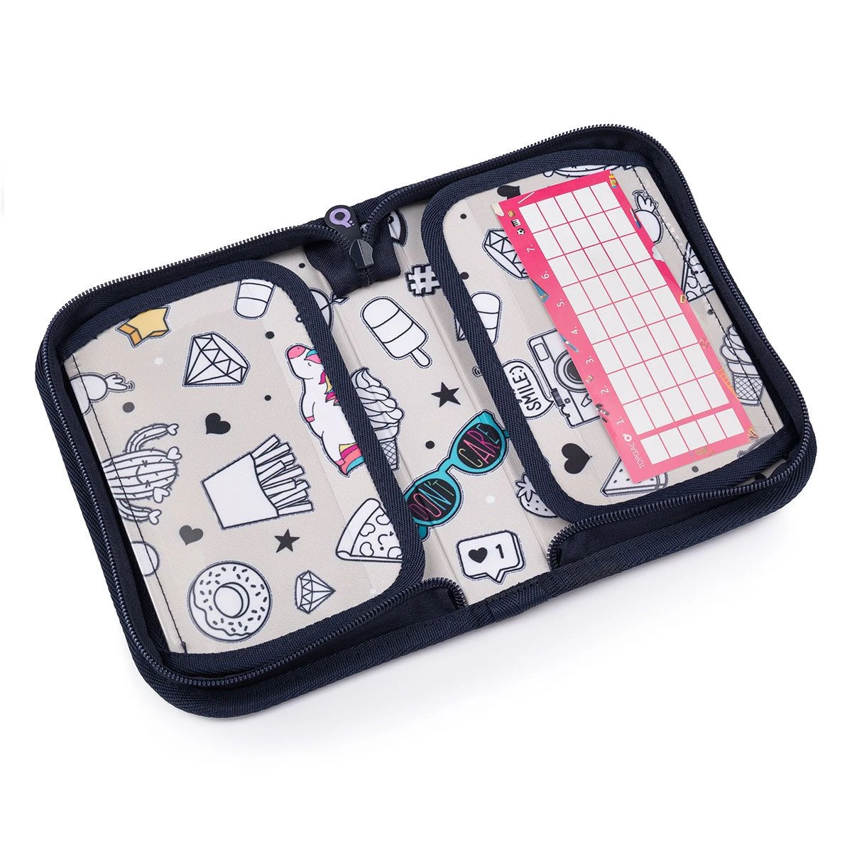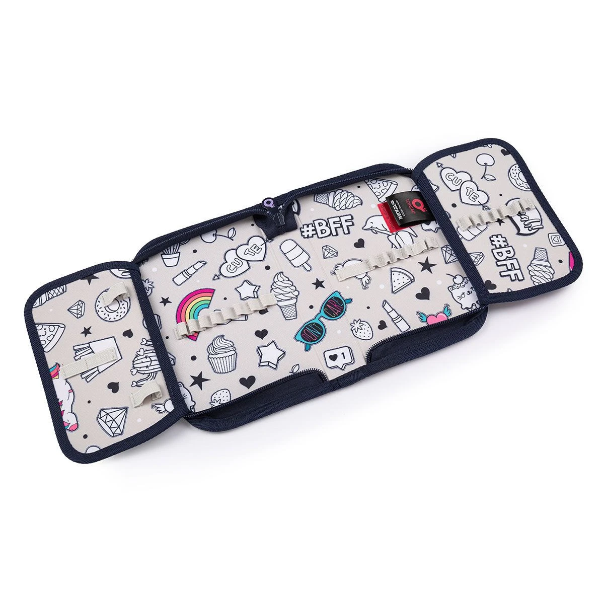 Im gleichen Design zu kaufen gibt es ein Einkammer Federmäppchen PENN oder ein ovales ETUE. Das Federmäppchen PENN passt beispielsweise in die kleine Fronttasche, in der sich auch ein abnehmbarer Karabiner für einen Schlüssel befindet. Sie können die Tasche aber auch als Tasche für eine Snackbox nutzen. Verstauen Sie außerdem eine Trinkflasche in eine Tasche an der Seite des Rucksacks.