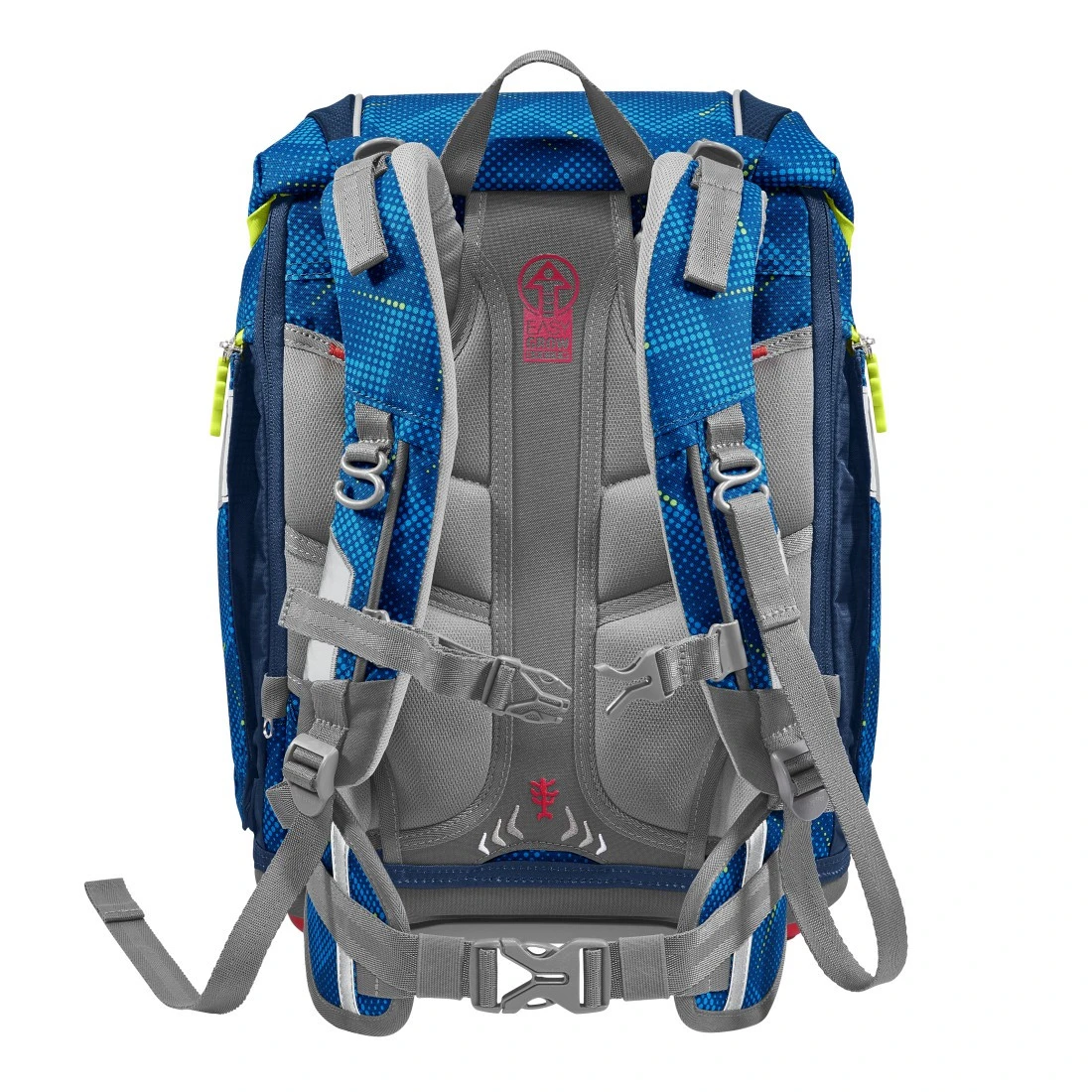 Mit dem EASY GROW SYSTEM lässt sich die Höhe der Schultergurte sowie die Rückenlänge des Schulranzens direkt auf dem Kinderrücken individuell anpassn – von 100 bis 150 cm Körpergröße. Die Anatomisch geformten Schultergurte sorgen für einen optimalen Sitz sowie bequemen Tragekomfort, auch bei langen Schulwegen. Die höhenverstallbare Brustgurt sowie der Hüftgurt stellen sicher, dass das Gewicht des Schulranzens von den Schultern genommen und auf den ganzen Körper verteilt wird. Über den ganzen Ranzen verteilt befinden sich reflektierende Elemente aus hochwertigem Material – für bessere Sichtbarkeit und damit Sicherheit im Dunkeln und im Straßenverkehr.