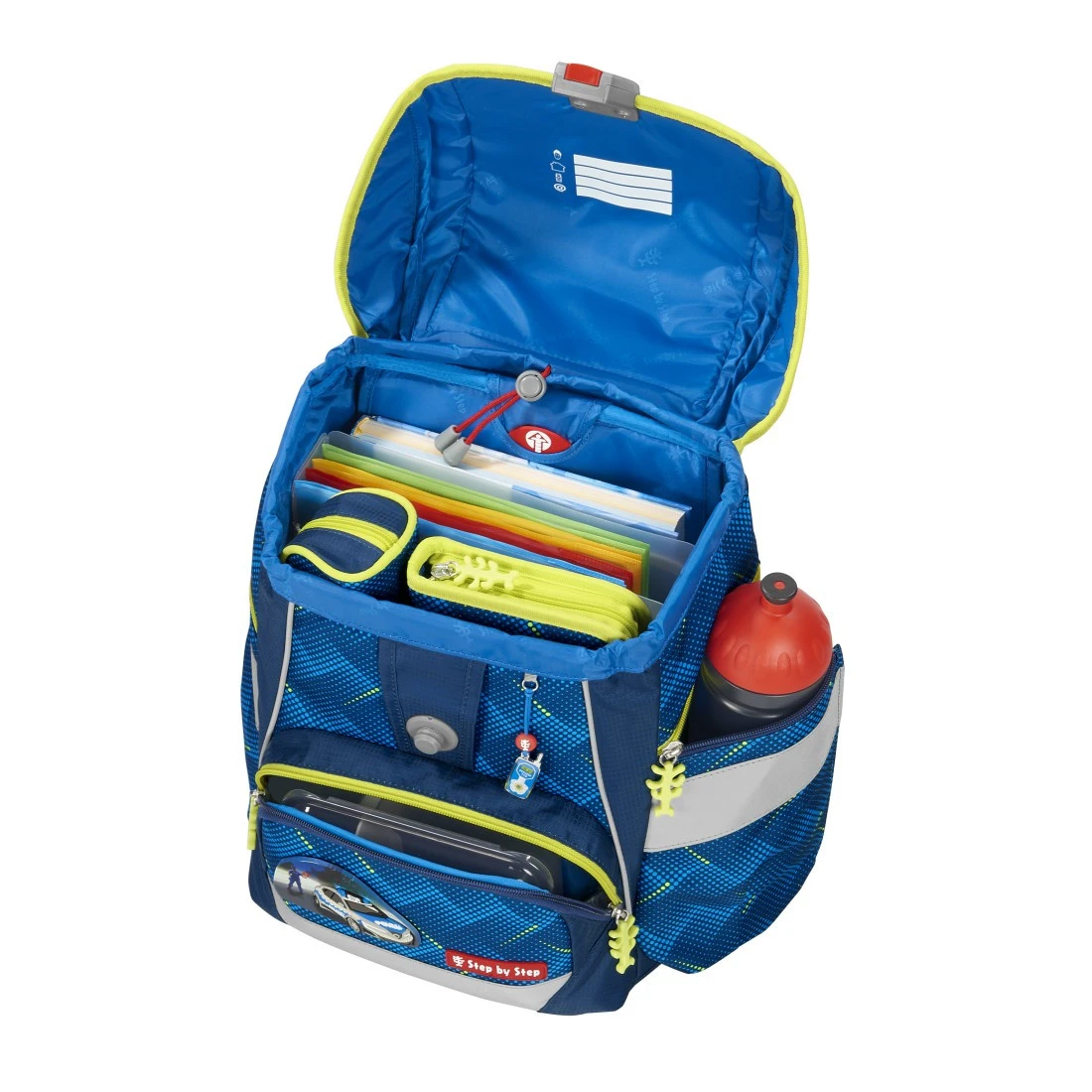Viel Platz für Bücher und Hefte: in dem großen Hauptfach kommen alle Hefte unter. Das extra Bücherfach nah am Rücken sorgt für eine optimale Gewichtsverteilung. Fronttasche für die Lunchbox – da bleibt die Lunchbox kühl oder warm, ohne dabei in den Innenraum zu drücken. 2 nach außen wachsende Seitentaschen für Trinkflasche und Co., sie werden mit Kletteverschlus erweitert. Der Turnbeutel lässt sich einfach mit Druckknöpfen und Schlaufe amSchulranzen befestigen. So sind die Hände auf dem Schulweg frei.