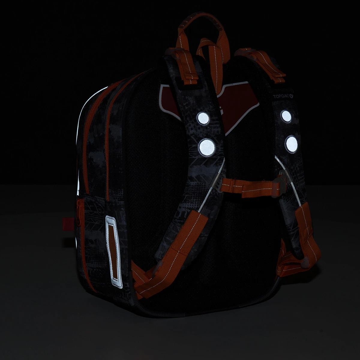 Reflektierende Elemente werden alle Eltern ansprechen, besonders im Winter. Auf diesem Schulrucksack sind genug davon, um die Sicherheit der Schulkinder zu gewährleisten. Davon können Sie sich auf den Detailfotos überzeugen, auf denen der Rucksack auch im Dunkeln fotografiert ist.
