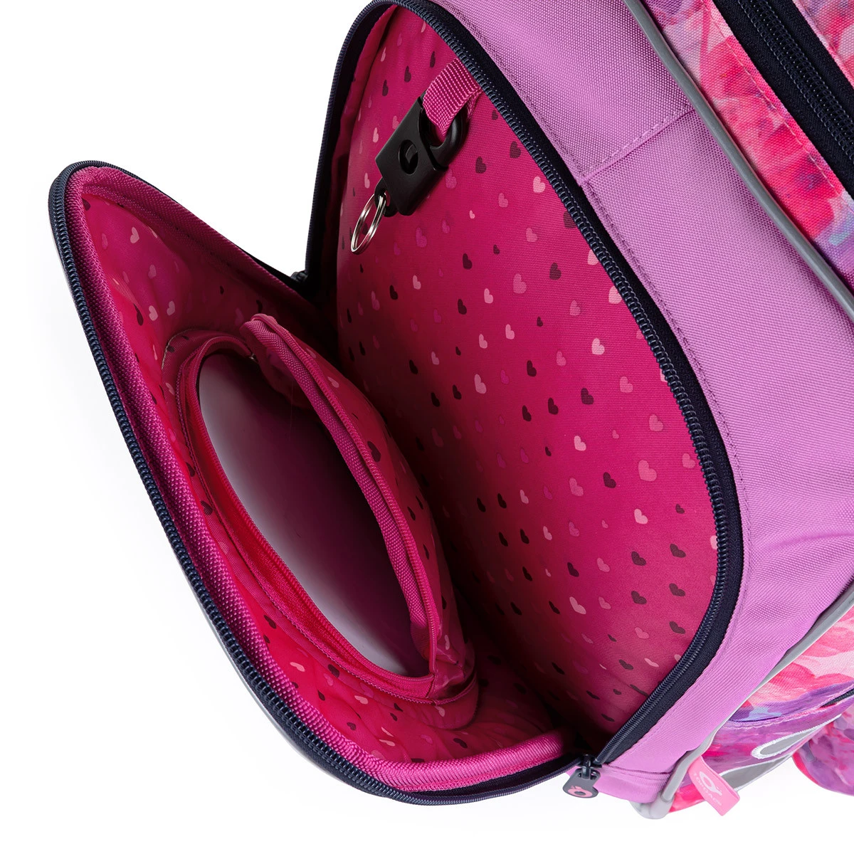 In der Tasche befindet sich auch ein abnehmbarer Karabiner, dank dem Sie nicht nach vergessenen Schlüsseln am Boden des Rucksacks unter Ihren Heften suchen müssen. Stecken Sie die Trinkflasche am besten in die Tasche an der Seite des Rucksacks.
