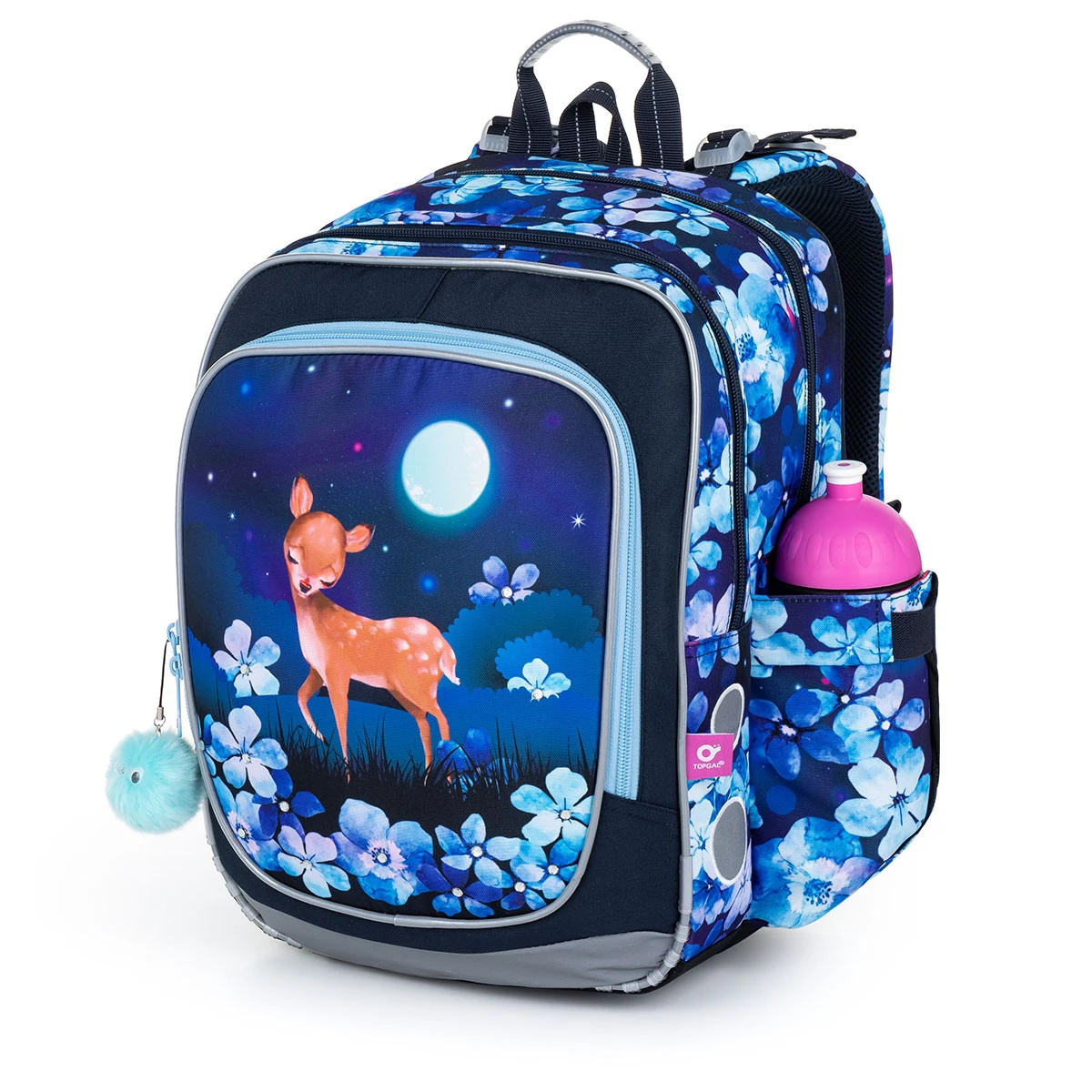 Der dunkelblaue Doppelkammerrucksack mit einem kleinen Hirschmotiv, glitzernden Strasssteinen und einem Plüschanhänger wird nicht nur von den Kleinsten gerne getragen.