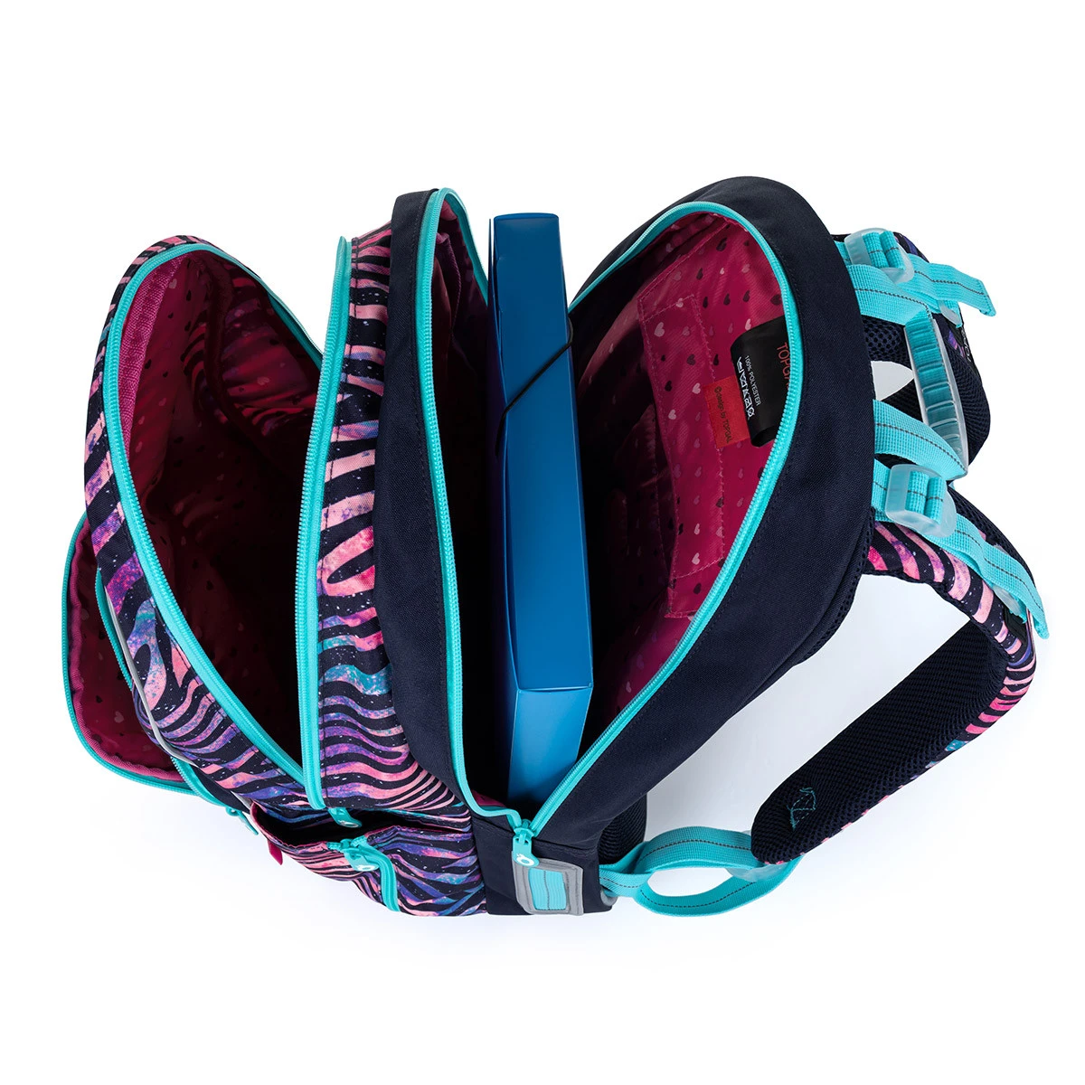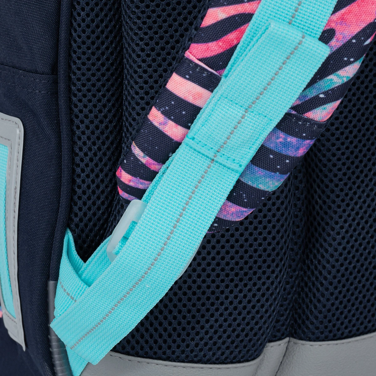 Der Rucksack verfügt über ein festes Rückensystem mit Aluminiumverstärkung, das nur 0,06 kg wiegt. Die Verstärkung hält den Rücken des Rucksacks in der richtigen anatomischen Biegung, daher empfehlen wir, das Rückensystem nicht abzunehmen. Dank der anatomischen Polsterung ist der Rücken des Rucksacks weich und eine gute Luftzirkulation zwischen Kinderrücken und Rucksack ist gewährleistet.
