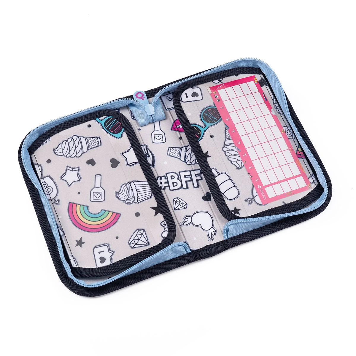 In dem vorderen schmaleren Fach finden Sie eine kleine Netztasche mit Reißverschluss und Namensschild.
