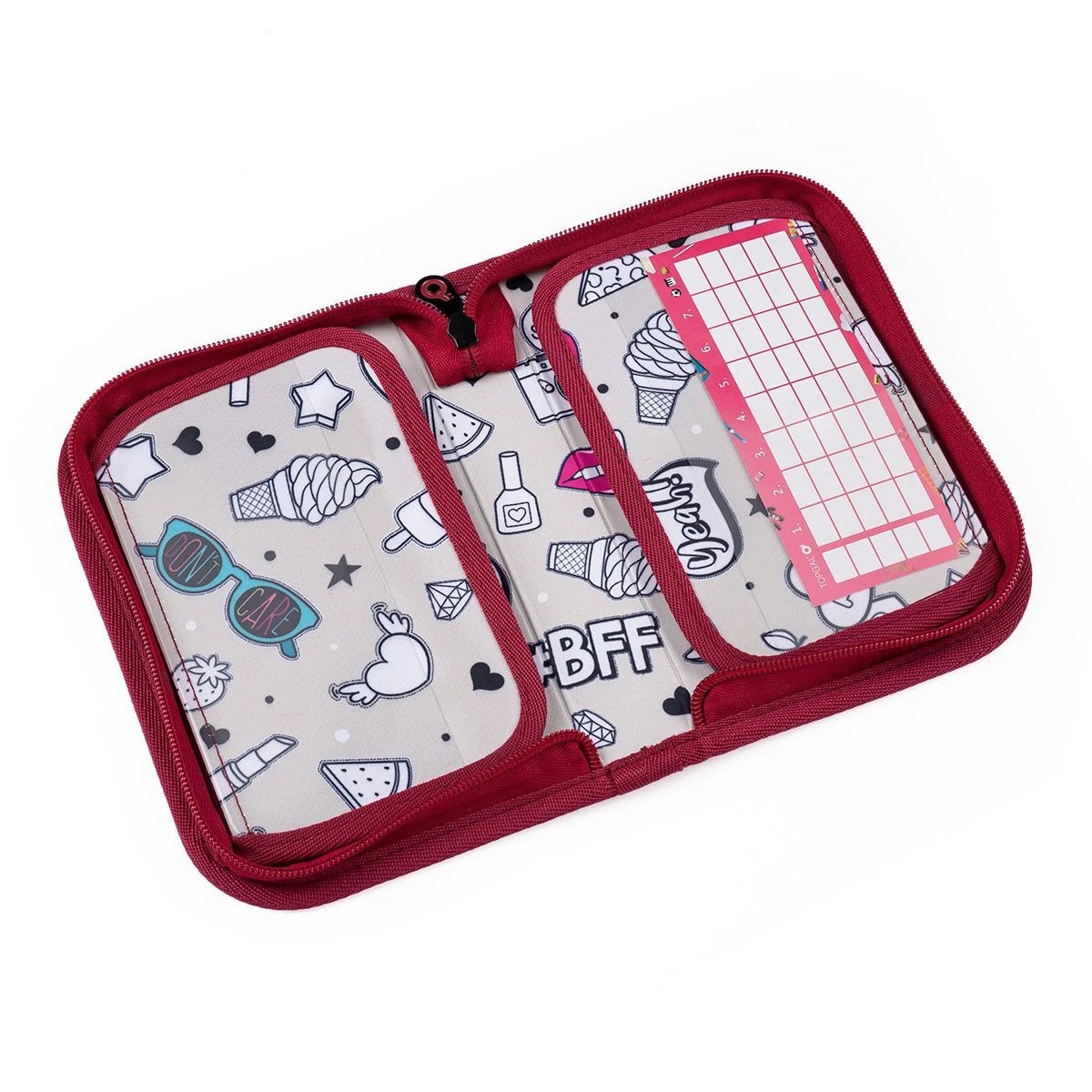 Das hintere Fach des Rucksacks ist schmaler und enthält eine kleinere Netztasche mit Reißverschluss. Das vordere Fach ist etwas breiter, geräumig und wird durch eine gepolsterte Trennwand in zwei Bereiche unterteilt. Sie können Lehrbücher und Hefte oder Lernen und Snacks bequem trennen. Sie können Ihre Snackbox aber auch in der tiefen Vordertasche unterbringen, die auch ein Namensschild und einen abnehmbaren Schlüsselclip enthält.