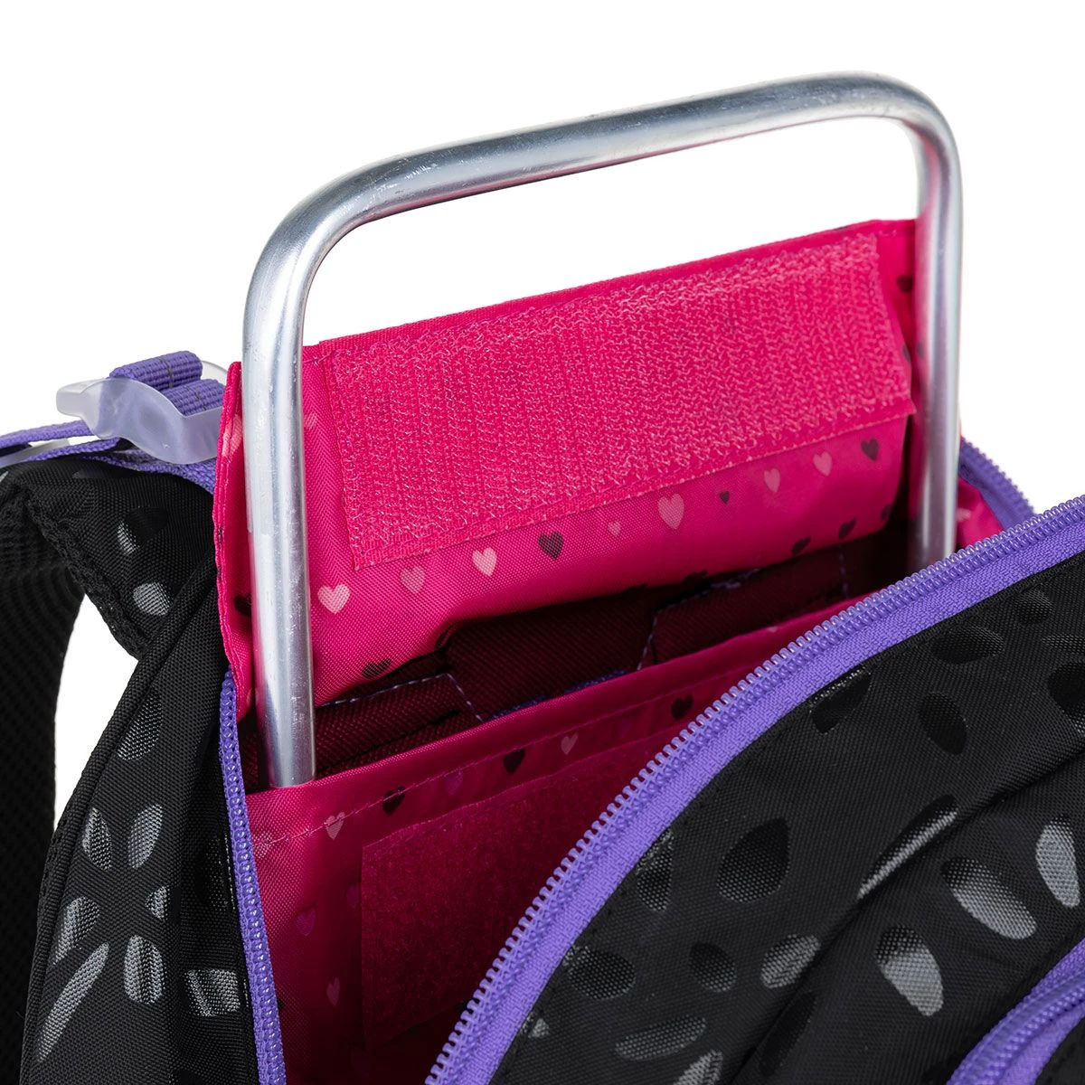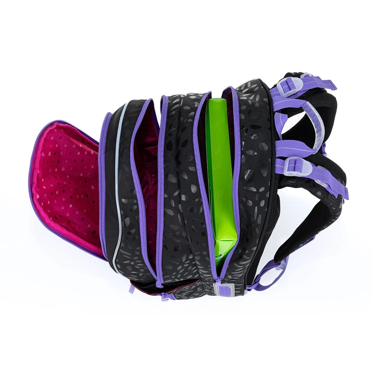 Der CODA-Doppelkammer-Rucksack eignet sich für alle größeren Mädchen der Grundschulklassen (empfohlen ab 125 cm). Sein Volumen reicht ohne Probleme bis zur zweiten Stufe. Der Rucksack ist in ruhigen Schwarztönen gehalten, die durch lila Reißverschlüsse und glänzende Elemente belebt werden. Der Rucksack hat zwei voluminöse Hauptfächer. Das hintere Fach des Rucksacks ist schmaler als das vordere, wir empfehlen, die schwersten Materialien dort unterzubringen und nach vorne zu entlasten. Die vordere (breitere) Kammer hat eine Netztasche mit Reißverschluss und ein Namensschild.