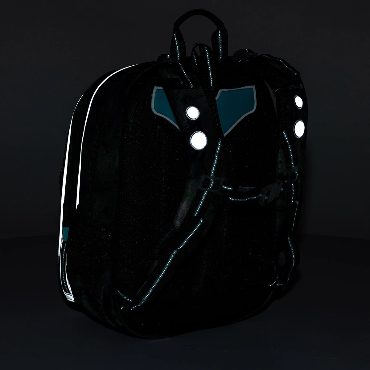 Auch bei diesem Modell haben wir nicht auf reflektierende Flächen verzichtet- Sie finden sie an den Schultergurten, an der Seite des Rucksacks und dessen Vorderteil sowie in den Rändern der Vorderfächer und an der Tasche.