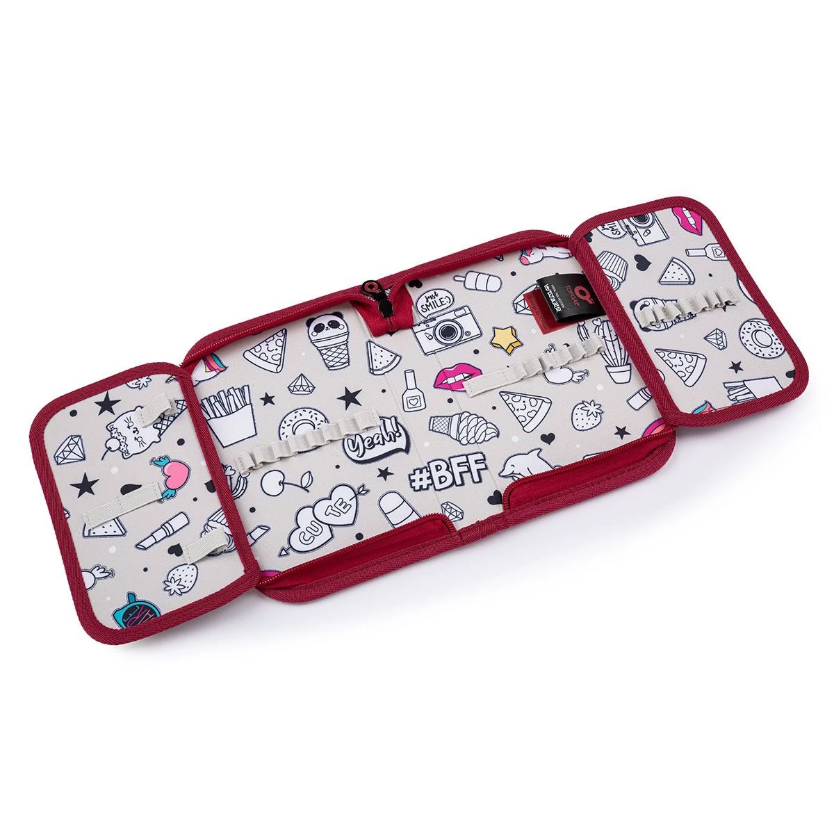 Das hintere Fach des Rucksacks ist schmaler und enthält eine kleinere Netztasche mit Reißverschluss. Das vordere Fach ist etwas breiter, geräumig und wird durch eine gepolsterte Trennwand in zwei Bereiche unterteilt. Sie können Lehrbücher und Hefte oder Lernen und Snacks bequem trennen. Sie können Ihre Snackbox aber auch in der tiefen Vordertasche unterbringen, die auch ein Namensschild und einen abnehmbaren Schlüsselclip enthält.