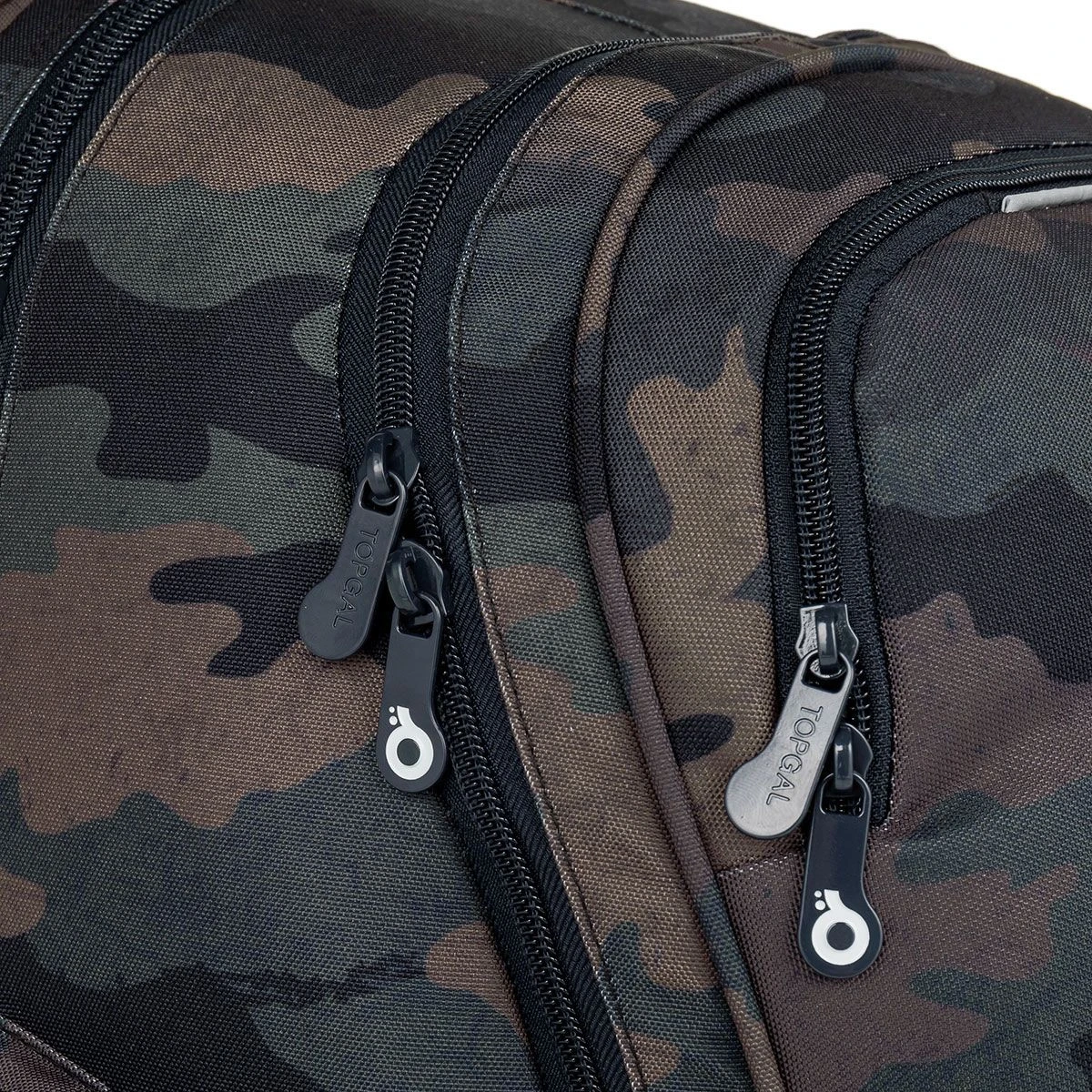 Camouflage-Rucksack mit modischem Aufnäher. Der Rucksack mit zwei Kammern und gepolstertem, anatomisch geformtem Rücken ist dank der leichten Aluminiumverstärkung sehr robust. Das große Fach enthält ein gepolstertes Fach für Laptop und Tablet und ein kleineres für ein Handy oder eine Powerbank. Das unsterbliche Tarnmuster wird alle Soldaten und Naturliebhaber erfreuen.