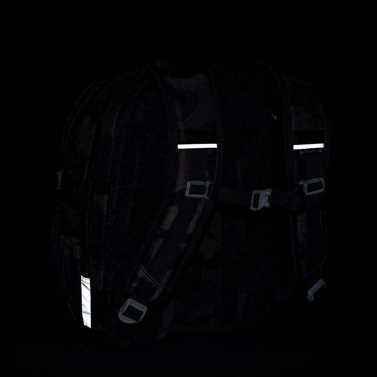 Reflektierende Elemente sind dezent in den Schnitt des Rucksacks eingebettet, so dass sie sich auf allen Seiten befinden – auf der Vorderseite, den Seiten und den Schultergurten. Der Stoff des Rucksacks ist mit einer Regenhülle versehen.