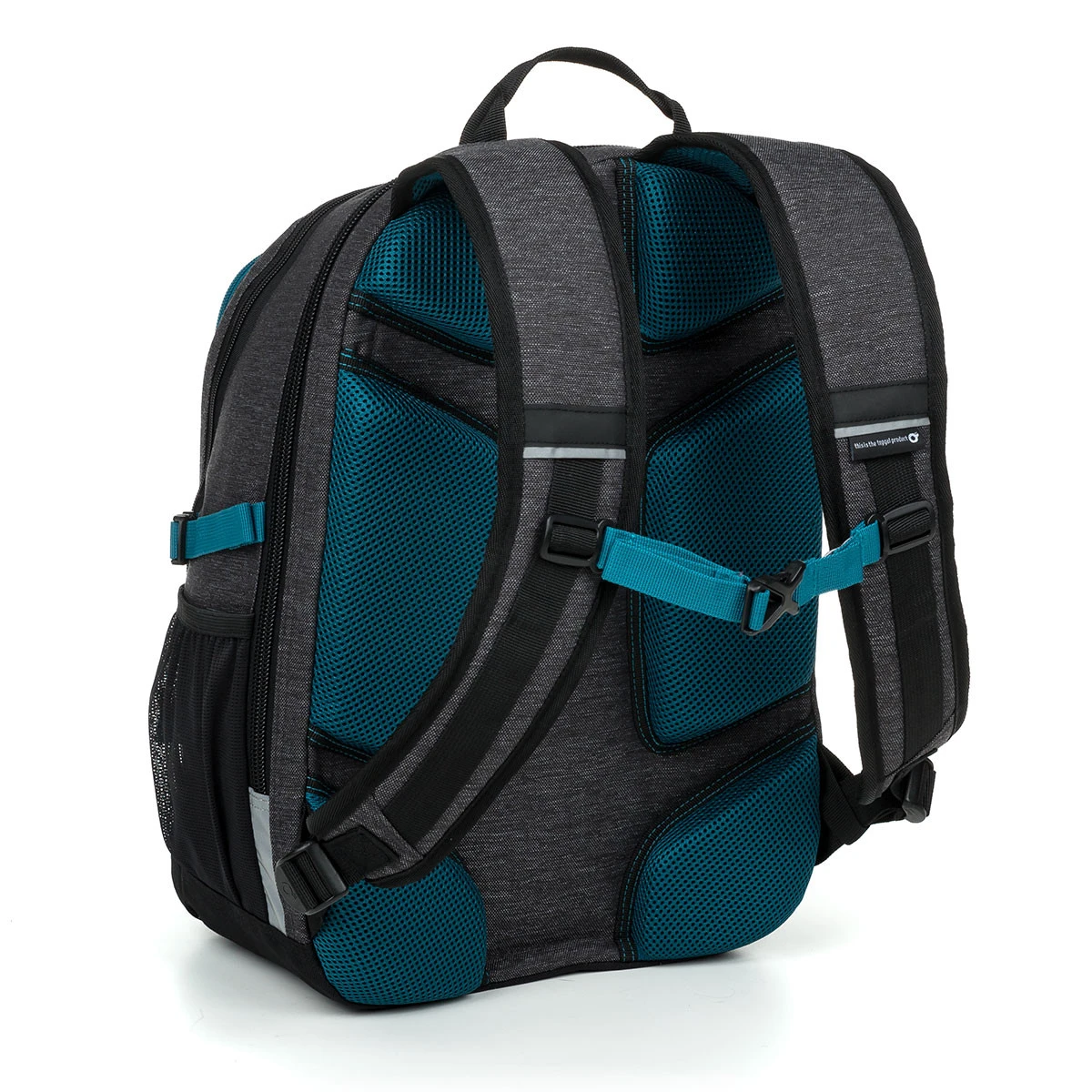 Das Rückenfach des Rucksacks ist sehr groß, Sie können die meisten Sachen darin verstauen, sowohl für die Schule als auch zum Beispiel für Freizeitaktivitäten. Im inneren Fach befindet sich eine gepolsterte Tasche für einen Laptop (bis 15,4“) oder Ordner und ein weiteres kleineres Fach, zum Beispiel für ein Handy oder eine Powerbank. Das vordere Fach ist schmaler, es enthält eine Netztasche für Kleinteile und einen Karabiner mit langen Federn für um einen Schlüssel zu befestigen. Sie werden die beiden Vordertaschen auf jeden Fall schätzen– die tiefere, voluminöse und auch die kleiner vorne am Rucksack.