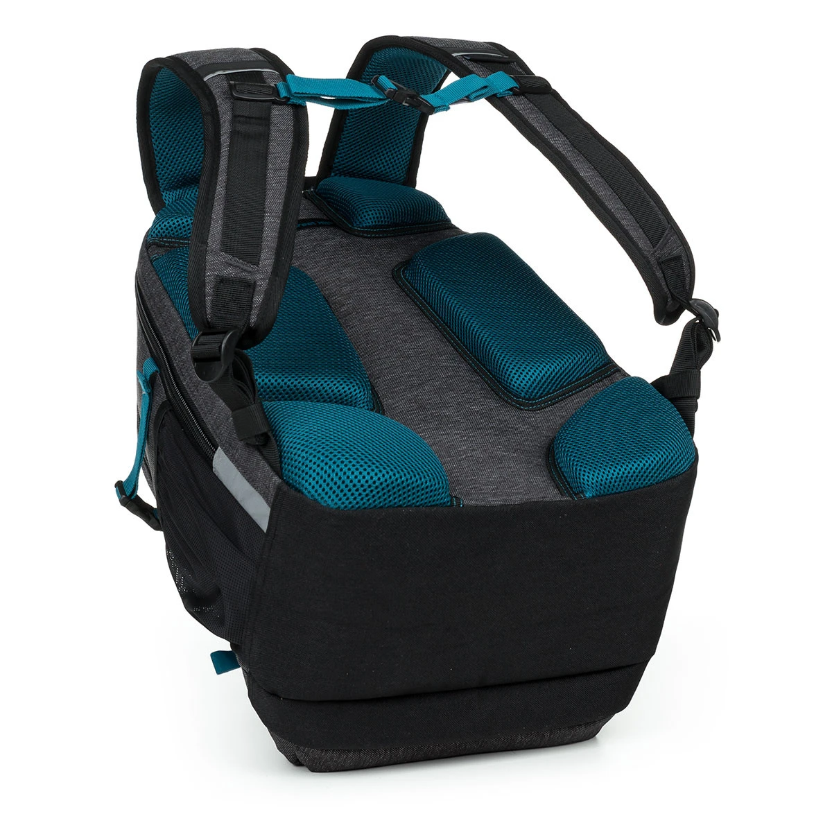 Die Rückseite des Rucksacks ist weich gepolstert, anatomisch geformt und mit Aluminiumverstärkung verstärkt. Auch die Schultergurte sind gepolstert und anatomisch geformt. Diese sind höhenverstellbar, ebenso wie der Brustgurt.