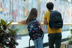 Der zweigeteilte Zweiundsiebzig-Liter-Rucksack mit zwei Vordertaschen ist ein idealer Begleiter für die Sekundärstufe Grundschule, Gymnasium, Uni, aber auch für die Freizeit. Das hintere Fach ist das größte und bietet Platz für das notwendige schwere Schulmaterial. Auf der Rückseite befindet sich eine gepolsterte Tasche für Notebook oder Dokumente und noch eine kleinere, zum Beispiel für ein Handy. Das vordere schmalere Fach verbirgt eine Netztasche für Kleinteile und ein Gummiband mit Karabiner für Schlüssel. Auf der Vorderseite des Rucksacks befinden sich zwei kleinere Taschen. In den beiden passen problemlos Federmäppchen zum Beispiel das ETUE 21028 im selben Design.